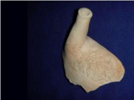 | Description / विवरण | Fragment of a spouted vessel is having spout with a hole at the end of it and in the body part of the vessel is having some embossed floral design |