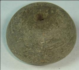 | Description / विवरण | Small terracotta bead with betel nut body and flat base. It has perforated hole in centre and surrounded with striation marks. It is semi fine and has a depression at base. |