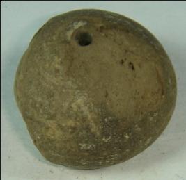 | Description / विवरण | Small terracotta bead with betel nut body and flat base. It has perforated hole in centre and surrounded with striation marks. It is semi fine and has a depression at base. Its half of the body is chipped off. |