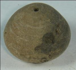 | Description / विवरण | Small terracotta bead with betel nut body and oval base. It has perforated hole in centre and surrounded with striation marks. It is semi fine and has a depression at base, |