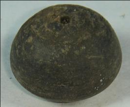 | Description / विवरण | Small terracotta bead with betel nut body and flat base. It has perforated hole in centre and surrounded with striation marks. It is semi fine and has a depression at base. |
