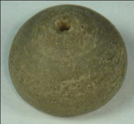 | Description / विवरण | Small terracotta bead with betel nut body and flat base. It has perforated hole in centre and surrounded with striation marks. It is semi fine and has a depression at base. |
