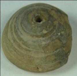 | Description / विवरण | Small terracotta bead with betel nut body and flat base. It has perforated hole in centre and surrounded with striation marks. It is semi fine and has a depression at base. It is half broken from one side. |