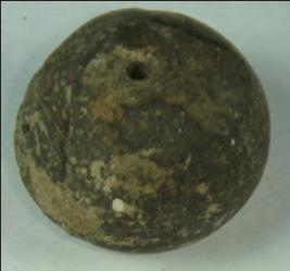 | Description / विवरण | Well made, perforated terracotta bead, betel nut in shape with a depression at the base. It is partially flaked off. |