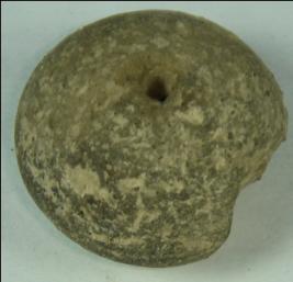 | Description / विवरण | Small terracotta bead with betel nut body and flat base. It has perforated hole in centre and surrounded with striation marks. It is semi fine and has a depression at base. Its one side s lower body and base is chipped off. |