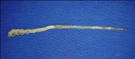 | Description / विवरण | Copper Antimony rod a pointed end and the other end has on flat end. The end is slightly bend. It was probably used as a hair pin. |