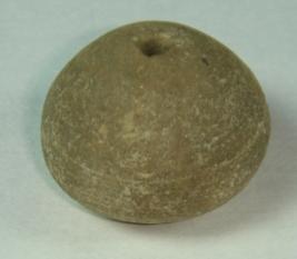 | Description / विवरण | Perforated terracotta betel nut shaped with a slight-depression on the base. Concentric circles are not clearly visible. |