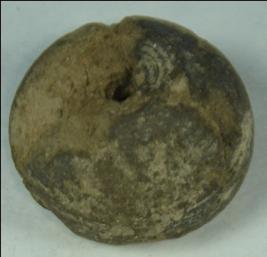 | Description / विवरण | Small terracotta bead with betel nut body and flat base. It has perforated hole in centre and surrounded with striation marks. It is semi fine and has a depression at base. The body is almost weathered off and mutilated. |