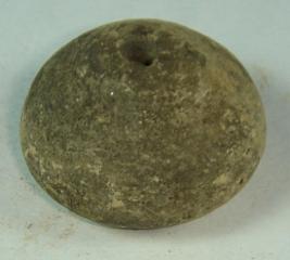 | Description / विवरण | Ill fired, perforated terracotta bead, betel nut shape with deep circular depression on the base, striation mark is very prominent on the body. |