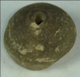 | Description / विवरण | Small terracotta bead with betel nut body and flat base. It has perforated hole in centre and surrounded with striation marks. It is semi fine and has a depression at base. Its base is half chipped off. |