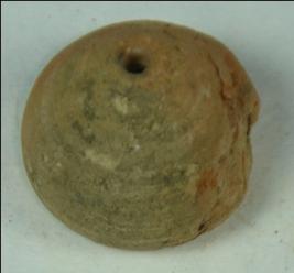 | Description / विवरण | Small terracotta bead with betel nut body and flat base. It has perforated hole in centre and surrounded with striation marks. It is semi fine and has a depression at base, body is chipped off from one side. |