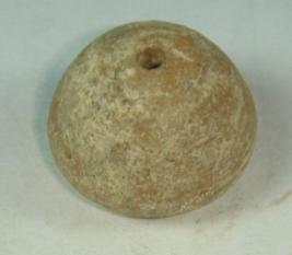 | Description / विवरण | Perforated terracotta bead, betel nut shape with deep circular depression on the base. A part of the lower part of the body is broken. |