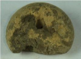 | Description / विवरण | Small terracotta bead with betel nut body and flat base. It has perforated hole in centre and surrounded with striation marks. It is semi fine and has a depression at base. Its half body is broken. |