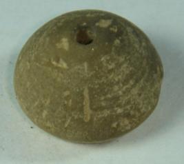 | Description / विवरण | Perforated terracotta bead betel nut in shape with a slight depression on the base. The top of the bead is flat and circular. |