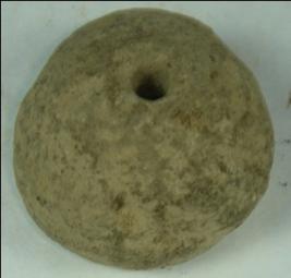 | Description / विवरण | Small terracotta bead with betel nut body and flat base. It has perforated hole in centre and surrounded with striation marks. It is semi fine and has a depression at base. It has earthly incrustation on all over the body. |