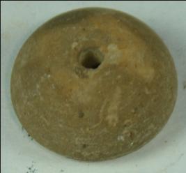 | Description / विवरण | Small terracotta bead with betel nut body and flat base. It has perforated hole in centre and surrounded with striation marks. It is semi fine and has a depression at base. |