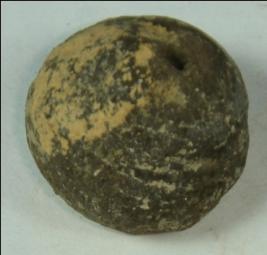 | Description / विवरण | Small terracotta bead with betel nut body and flat base. It has perforated hole in centre and surrounded with striation marks. It is semi fine and has a depression at base. The body is mutilated and rubbed off. |