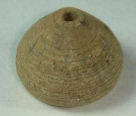 | Description / विवरण | Perforated, betel nut shaped terracotta bead with slight depression at the base. Close concentric circles are present on the body. |
