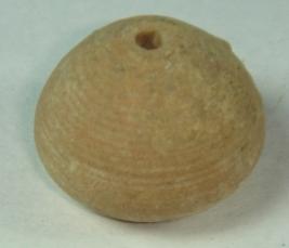 | Description / विवरण | Plain, perforated, betel nut shaped terracotta bead with a depression at the base. Its surface is slightly peeled off. |