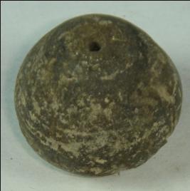 | Description / विवरण | Small terracotta bead with betel nut body and flat base. It has perforated hole in centre and surrounded with striation marks. It is semi fine and has a depression at base. The body is slightly rubbed off. |