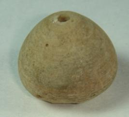 | Description / विवरण | Perforated, terracotta bead with betel nut shaped body which is slightly flaked off, with a circular depression at the base. Concentric circles are present around the body. |