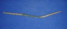 | Description / विवरण | Copper Antimony rod lower end having a pointed tip. The upper end is designed with incised lines and grooves. It is probably a hair ornament. It is bend at center. |