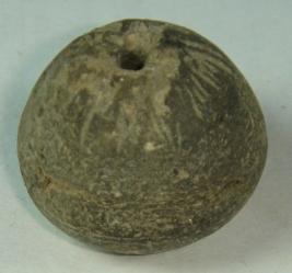 | Description / विवरण | Perforated, betel nut shaped terracotta bead with a depression at the base. Its top and base is flaked off. |