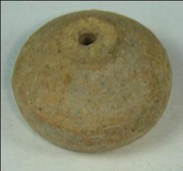 | Description / विवरण | Small terracotta bead with betel nut body and flat base. It has perforated hole in centre and surrounded with striation marks. It is semi fine and has a depression at base. |