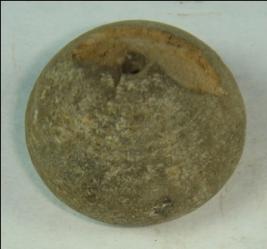 | Description / विवरण | Small terracotta bead with betel nut body and flat base. It has perforated hole in centre and surrounded with striation marks. It is semi fine and has a depression at base. The upper part of the body is slightly chipped off. |
