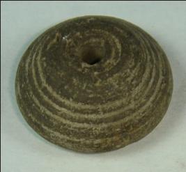 | Description / विवरण | Small terracotta bead with betel nut body and flat base. It has perforated hole in centre and surrounded with striation marks. It is semi fine and has a depression at base. |