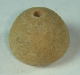 | Description / विवरण | Perforated, betel nut shaped terracotta bead with a depression at the base. |