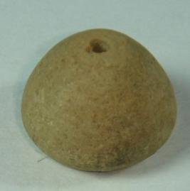 | Description / विवरण | Plain, perforated, betel nut shaped terracotta bead with concentric circles around the base. |