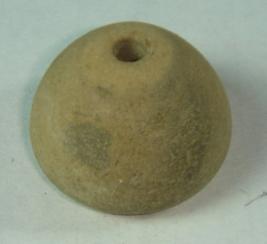 | Description / विवरण | Plain, perforated betel nut shaped terracotta bead with a circular depression at the base. |