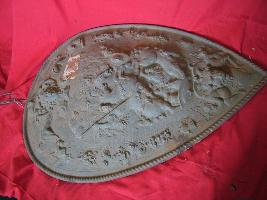 | Description / विवरण | It is a shield in leaf shape. War scene is embossed on one side. Some human figures are lying on the ground and some horse riders are holding flag and weapon in their hands. |