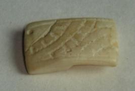 | Description / विवरण | Shell bead, rectangular in shape, having 3 perforated holes on both sides with one surface plain and other having incised design at the border, two vertical lines are seen and in between, there are semi circular incised lines followed by incised horizontal lines. |
