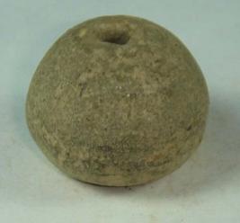 | Description / विवरण | Perforated terracotta bead, betel nut in shape, surface is rough depression at base, clay incrustation all over. |