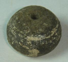 | Description / विवरण | Well made, perforated betel nut shaped terracotta bead with a depression at the base. The top of the bead is corroded. |