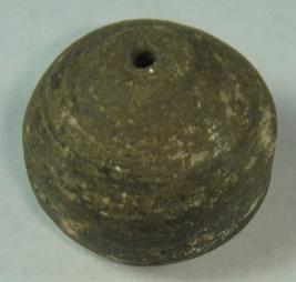 | Description / विवरण | Perforated terracotta bead, betel nut in shape, surface is smooth with a depression at the base. |