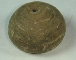 | Description / विवरण | Perforated terracotta bead, betel nut in shape with depression at the base surface is smooth clay incrustation all over. |