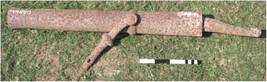 | Description / विवरण | This is a light gun cast in iron. The cylinder of the gun slightly tappers from breech towards muzzle. The trunnions provided in the middle of the chase are formed by combination of two thick bars bent in shape of ring around barrel further engaged with a fork swivel having perforated pointed end. An inscription is seen near trunnions on the chase It has muzzle astragal it has copper ring. A vent hole is provided on the breech. Back site U on the top portion of breech is missing only empty socket is visible now. The rear end of the cannon is provided with a cascabel having a slight bent and a knob. |