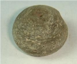 | Description / विवरण | Perforated terracotta bead, betel nut body with a slight depression at base. |