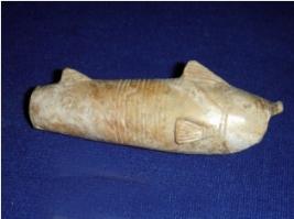 | Description / विवरण | Fish shaped, shell toilet container, having wide open mouth. The tail is missing and instead of it, a hole is there. Its fins are seen and the body is decorated with incised circular lines and dot designs. A part of mouth is broken. |