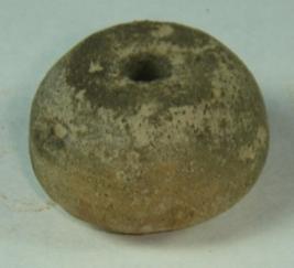 | Description / विवरण | Perforated terracotta bead, betel nut in shape depression at the base, surface is rough clay incrustation all over. |