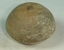| Description / विवरण | Simple perforated terracotta bead, biconvex in shape, clay incrustation on the body. |