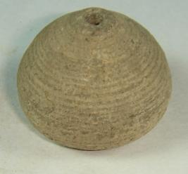 | Description / विवरण | Perforated terracotta bead, pot-shaped tip is slightly raised, striation mark on the entire body except at centre the base slightly depressed. |