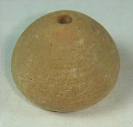 | Description / विवरण | Perforated terracotta bead, betel nut body with slight depression at the base. |