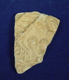 | Description / विवरण | Fragment of a lime plague. A human face is seen whose right hand is visible. The portion of the figurine are bedecked with earrings and bangles. Criss cross design is on further right. |