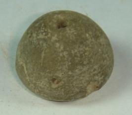 | Description / विवरण | Simple perforated terracotta bead, betel nut in shape, flaked off at the base. |