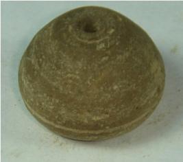 | Description / विवरण | Perforated terracotta bead, betel nut in shape, base is flat, one deep incised circle above the base part, clay incrustation all over. |