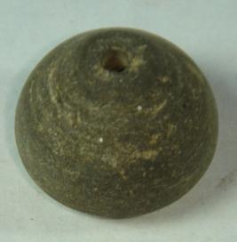 | Description / विवरण | Perforated terracotta bead, betel nut in shape, flaked off at one portion. |